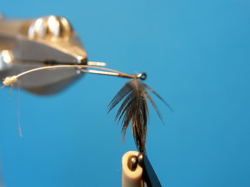 3. Lay the thread on the inside of the featherstem and put together thread and feather with a hackleplier.
